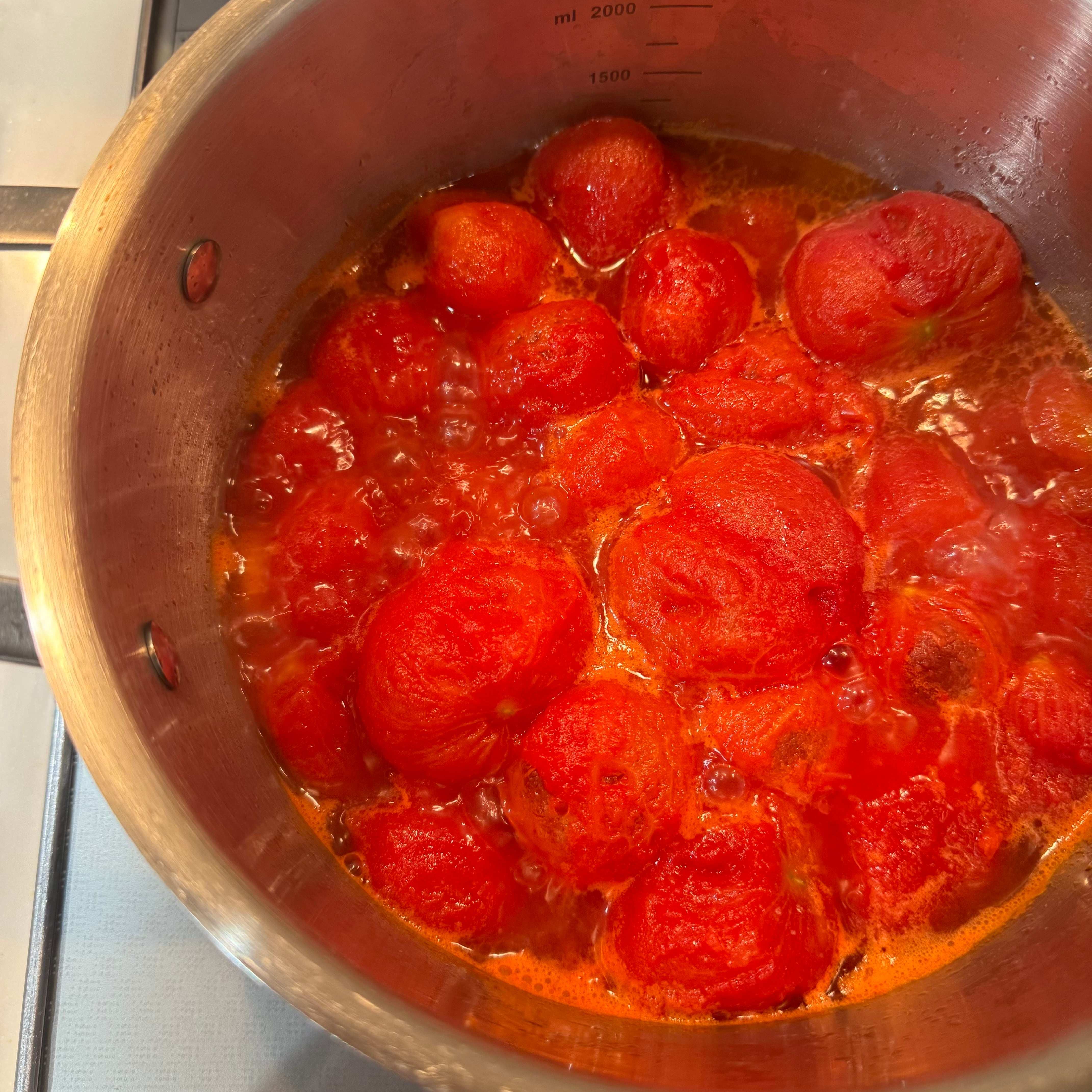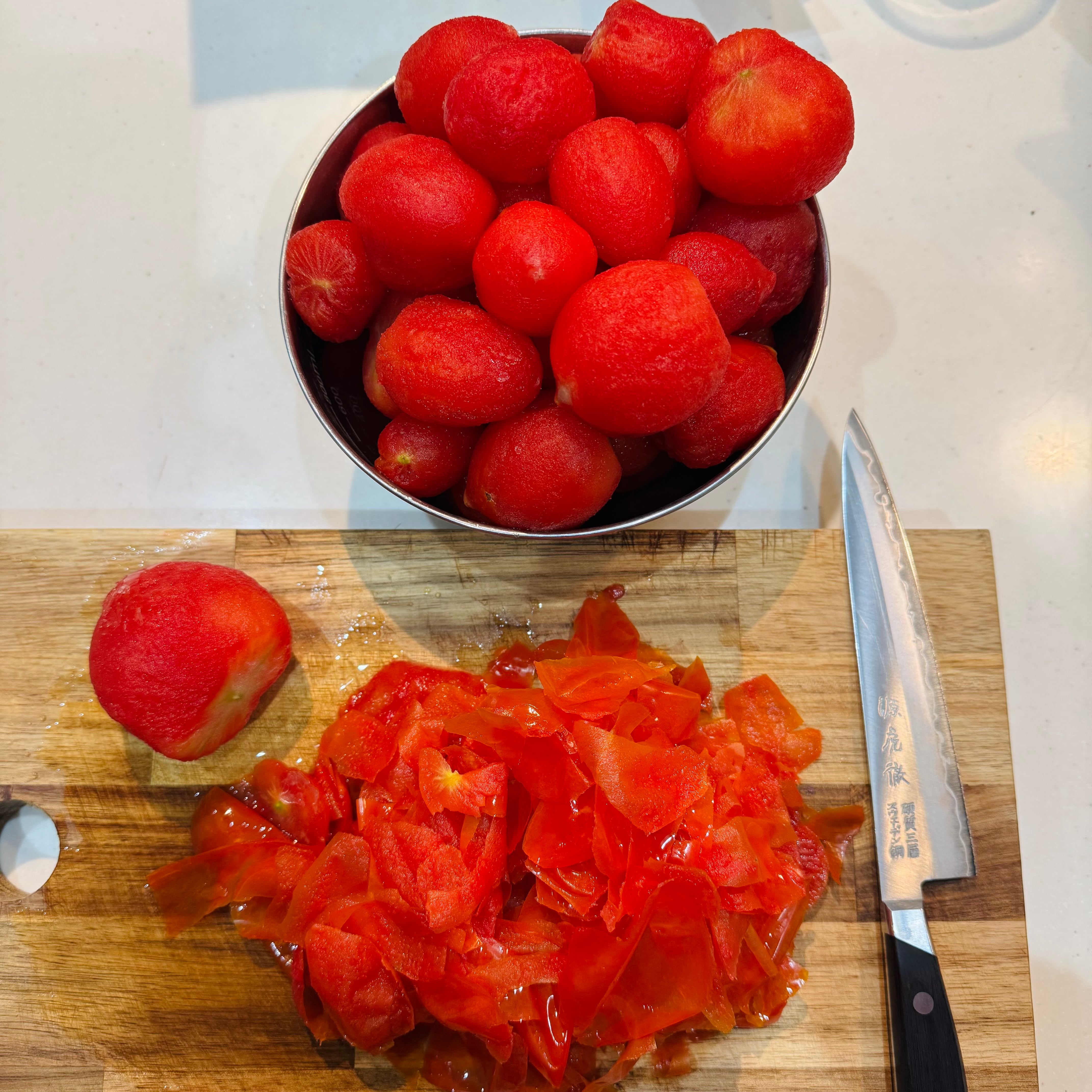 写真はしばらく自然解凍したトマトの、ヘタ側を少しカットして加熱前に皮を剥いた例です。