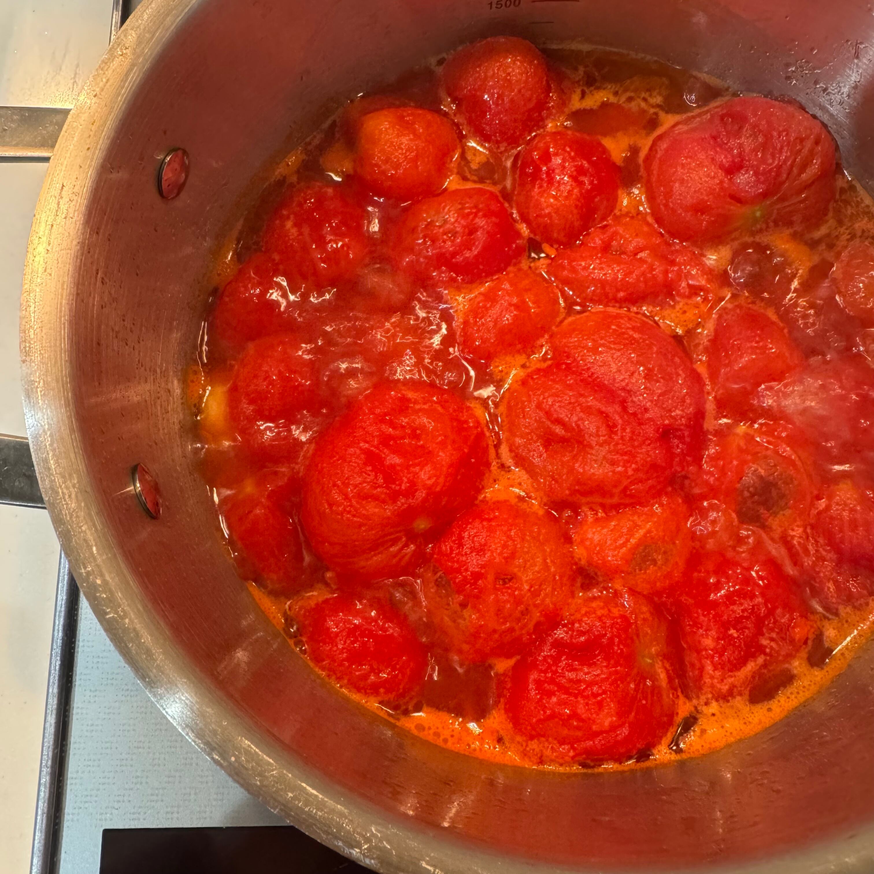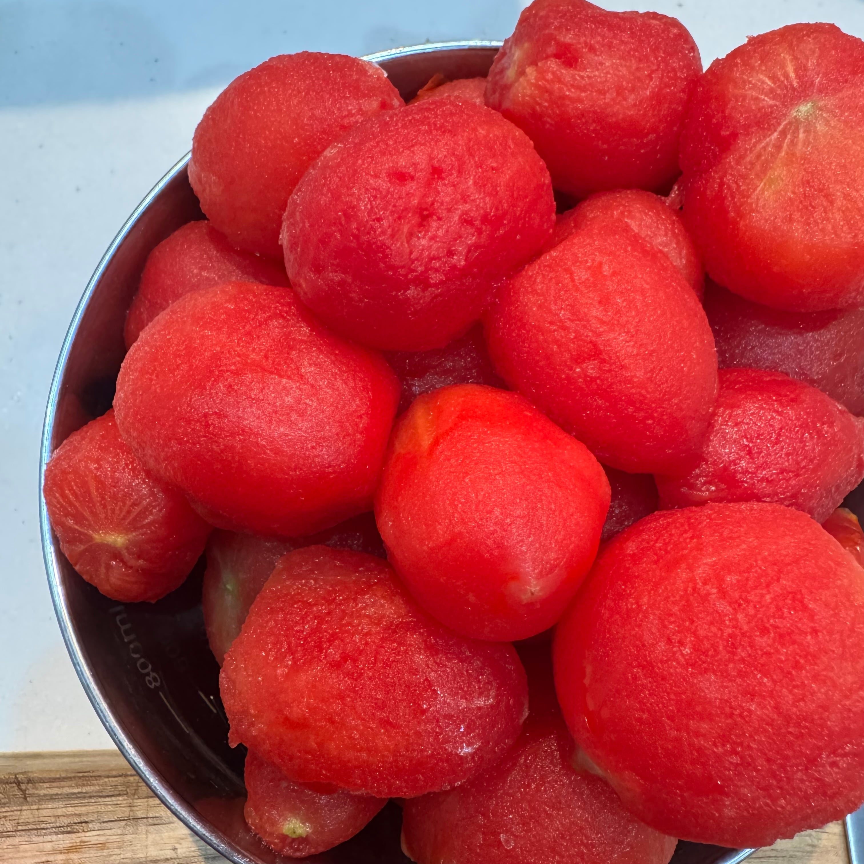 写真はしばらく自然解凍したトマトの、ヘタ側を少しカットして加熱前に皮を剥いた例です。